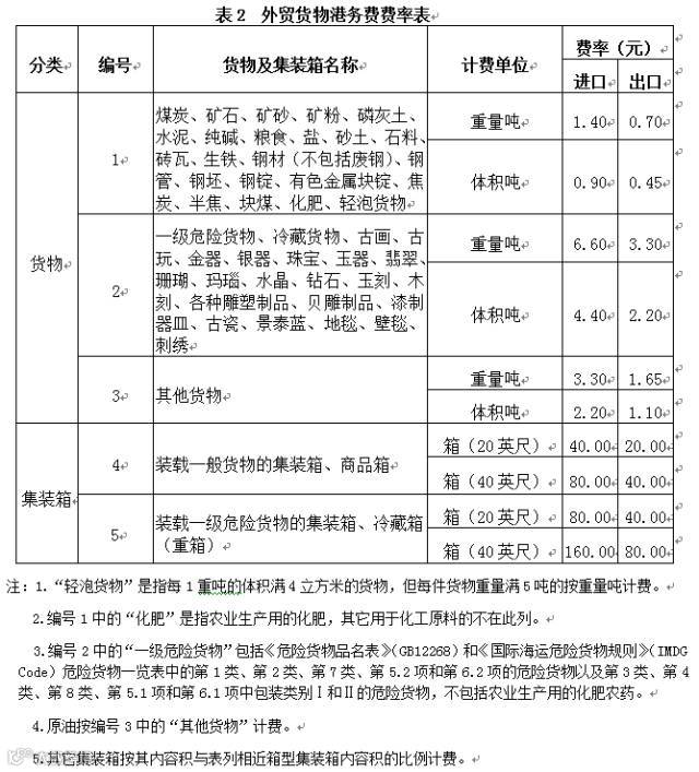 (一)外贸货物港务费按表2(外贸货物港务费费率表)规定费率分别计收进、出港货物港务费。