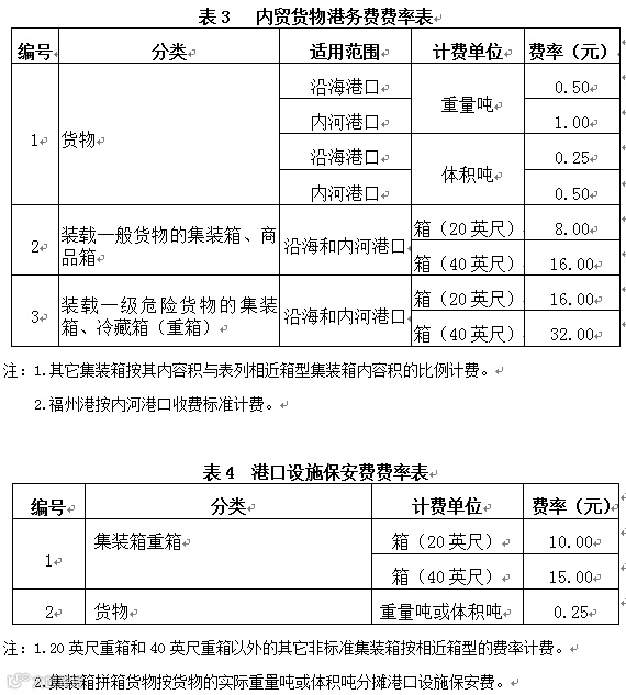 (一)内贸货物港务费按表3 (内贸货物港务费费率表)规定费率分别计收进、出港货物港务费。