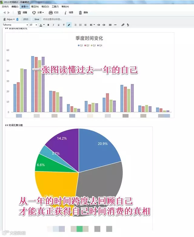 通过时间的流向和开销的分析、总结,可以知道做一件事是否按时开始执行、完成所需时间、自己的状态等,这样长期的坚持和分析,就可以根据自我的精力和状况来安排计划,来完成达到自己的目标。