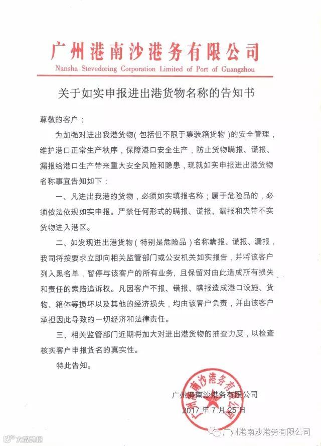 7月25日,广州港南沙港务有限公司发布《关于如实申报进出港货物名称的告知书》,明确表示码头对货物申报的监查会加大力度。