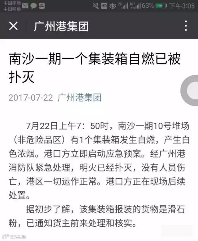 7月22日早上广州南沙一期10号堆场(非危险品区)有1个集装箱发生自燃,产生白色浓烟。港口方立即启动应急预案。经广州港消防队紧急处理,港区一切运作正常。