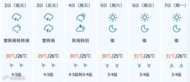 未来三天,我市以多云间阴天气为主,有阵雨或雷阵雨。2日,多云间阴,局部有阵雨,南风4-5级阵风7级,全市最低气温26-27℃,全市最高气温30~32℃。