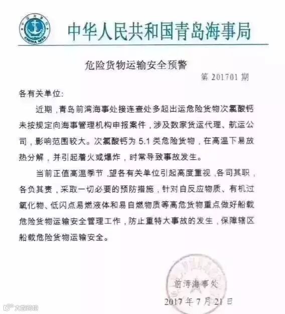 近期,青岛前湾海事处接连查处多起出运危险货物次氯酸钙未按规定向海事管理机构申报案件。涉及多家货运代理、航运公司,影响范围较大。