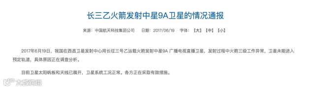 据中国航天科技集团公司官方网站消息,2017年6月19日,我国在西昌卫星发射中心用长征三号乙运载火箭发射中星9A 广播电视直播卫星,发射过程中火箭三级工作异常,卫星未能进入预定轨道,具体原因正在调查分析。目前卫星太阳帆板和天线已展开,卫星系统工况正常。各方正在采取有效措施。