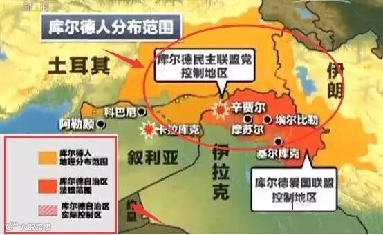 我们知道,库尔德人在中东的土耳其、叙利亚、伊拉克和伊朗地区有三千多万人(具体分布请遵照上图左下角显示),图中圆圈部分为库尔德人的分布范围,而一旦库尔德人独立成功,这些地区的库尔德人必定连结起来,于是,一个和伊拉克差不多大的国家也就建立起来了!