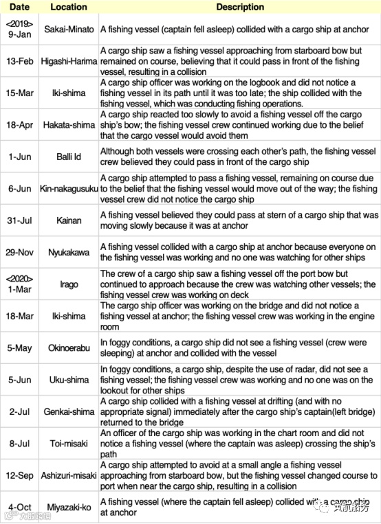 关于这一事件,UK P&I Club援引日本运输安全委员会(JTSB)的信息,分享了2019年和2020年所有货船和渔船碰撞的摘要: