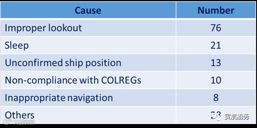 在上表中,涉及渔船的前五大问题原因中的四个(除了未能确认船只位置之外)和所有事件中的115起事件相关,占到73%。这四个原因表明,出于某种原因,不能依靠渔船采取行动避开其他船只。