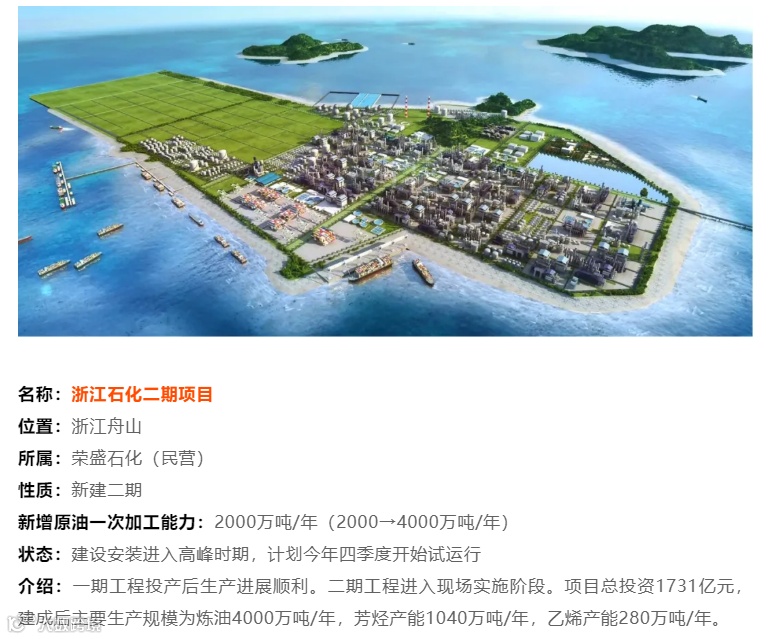 介绍:项目总体规划产能为4000万吨/年。该项目也是山东省新旧动能转换、产业结构调整的典型工程。其中,近期规划(2019-2025年)建设原油加工能力2000万吨/年,乙烯生产能力300万吨/年,配套建设下游化工装置。中远期规划(2026-2035)为再建2000万吨/年炼化一体化项目,以及配套的公用工程。