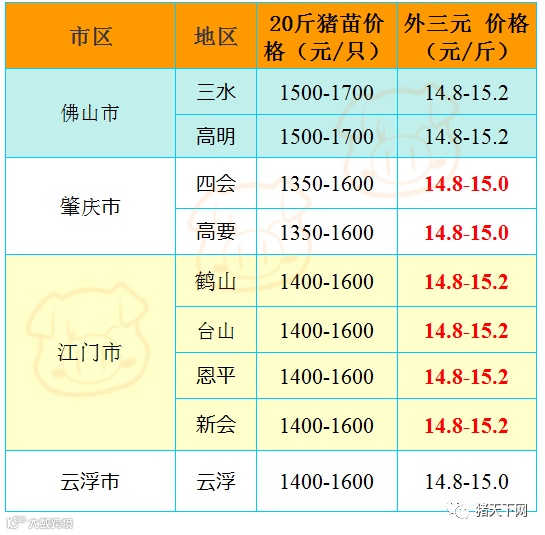 有红绿颜色部分是相对昨天有所变动的猪价;