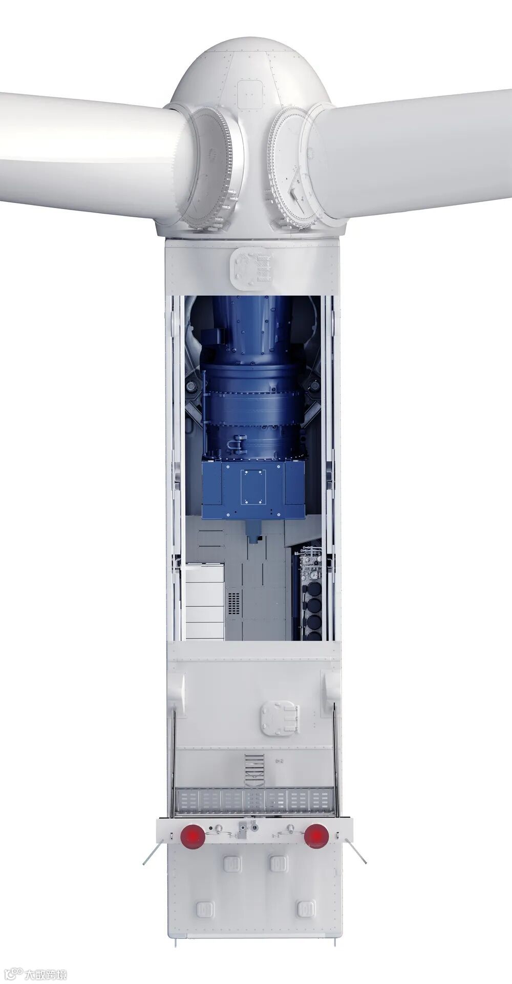 外观上,采用了永磁电机+中速齿轮箱设计的V150-5.6 MW的机舱显得更加纤细修长,在平衡了和叶轮的重量的同时留出了更宽敞的内部空间方便运维。