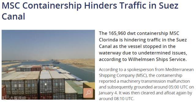 1月3号刚发生了APL和万海集装箱船发生碰撞导致漏油的事故,今天MSC集装箱船又在苏伊士运河搁浅了,2017年才刚过了3个工作日,就已经发生两起事故了......
