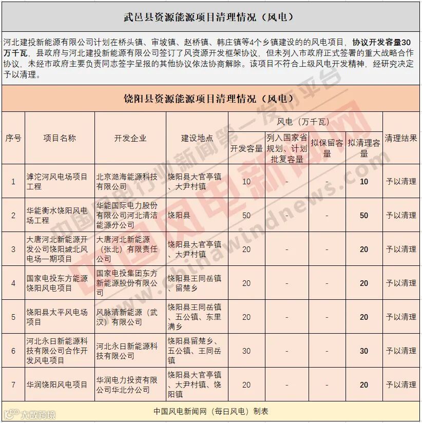 导读:河北省衡水市武邑县和饶阳县分别通报资源能源项目清理情况,因不符合上级风电开发精神