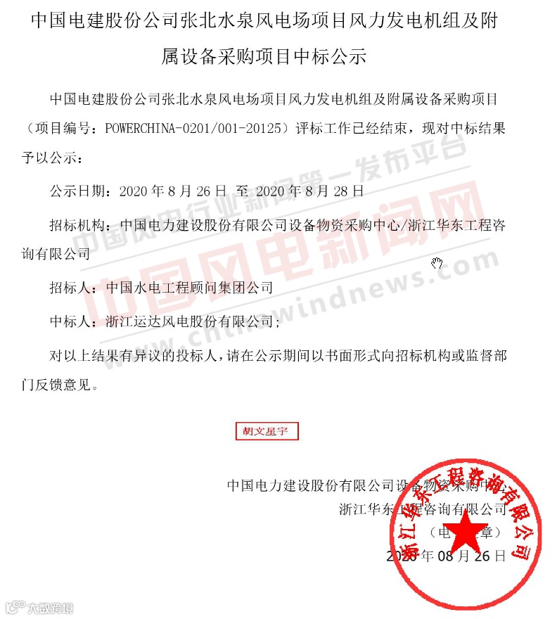 导读:中国电建股份公司张北水泉风电场项目风力发电机组及附属设备采购项目中标公示