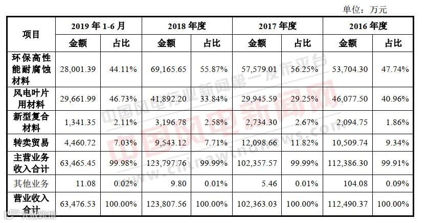 上纬新材专注于环保高性能耐腐蚀材料、风电叶片用材料、新型复合材料等产品的研发、生产和销售。2017年至2019年,分别实现营收10.24亿元、12.38亿元及13.49亿元。