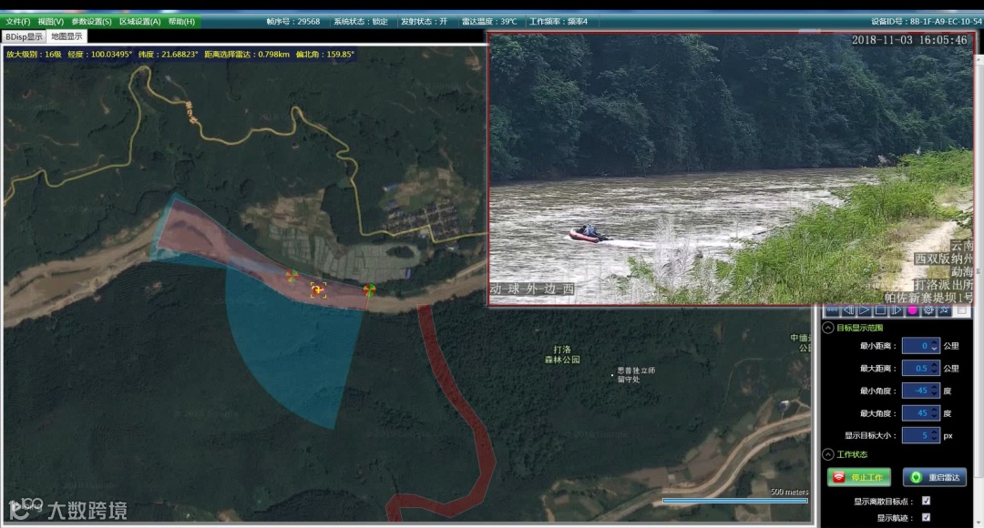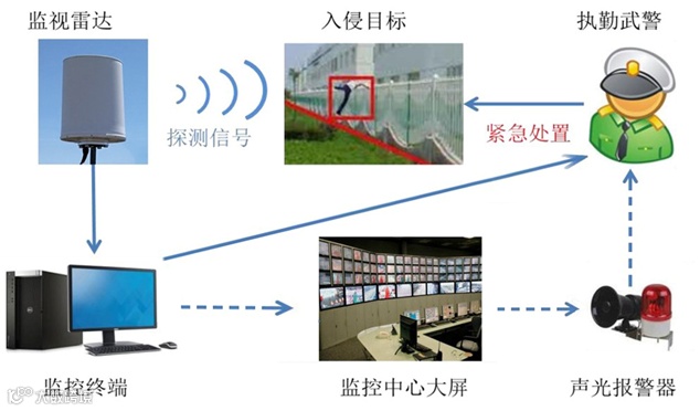 ● 雷达发现并将目标的位置信息(包括方位、距离或GPS坐标信息)、运动速度和运动轨迹上报到监控系统。