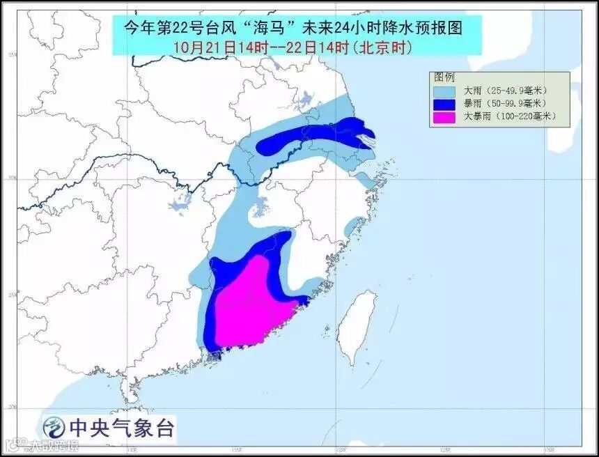 预计,“海马”将以每小时25公里左右的速度向北偏西方向移动,即将于今天中午前后在广东惠州到汕尾一带沿海登陆(强台风级,42米/秒,14级)。登陆后,“海马”将转向偏北方向移动,强度快速减弱,22日进入江西境内后,减弱为热带低压。