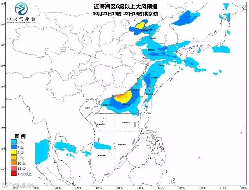 大风预报:21日14时至22日14时,东海西部海域、台湾海峡、南海东北部海域、东沙群岛附近海域以及杭州湾、浙江沿海、福建沿海、广东中东部及其沿海、珠江口区将有7~9级大风,其中,南海东北部以及广东东部沿海的风力有10~12级,阵风13~14级,广东东部沿海局地风力有13~14级,阵风15~16级。