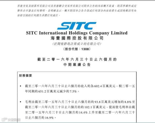 是的,这就是SITC,中国籍集装箱船公司:山东海丰国际。海丰国际(01308)近日发布了2016年上半年业绩公报,继续维持高盈利业绩。