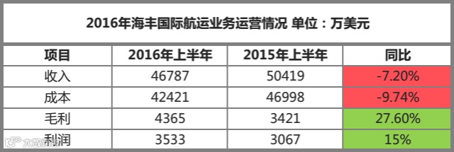 上半年,海丰国际实现营业收入6.0亿美元,相较2015年同期的6.51亿美元,同比减少约7.5%。得益于成本有效管控,因航用燃油成本大幅下滑,实现毛利1.02亿美元,相较2015年同期的9380万美元,同比增加约8.8%,毛利率进而升至16.9%(2015年同期为14.4%)。实现归属于本公司股东利润7050万美元,同比减少0.59%。