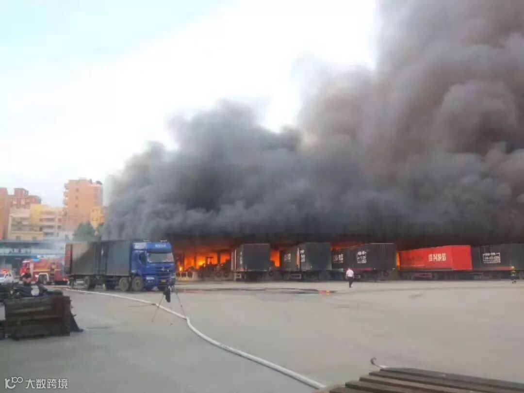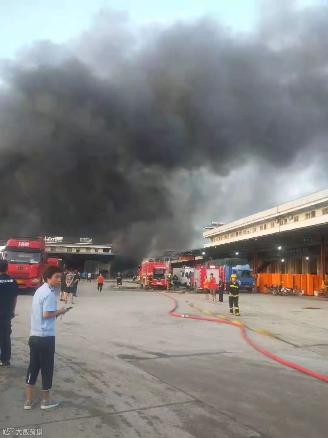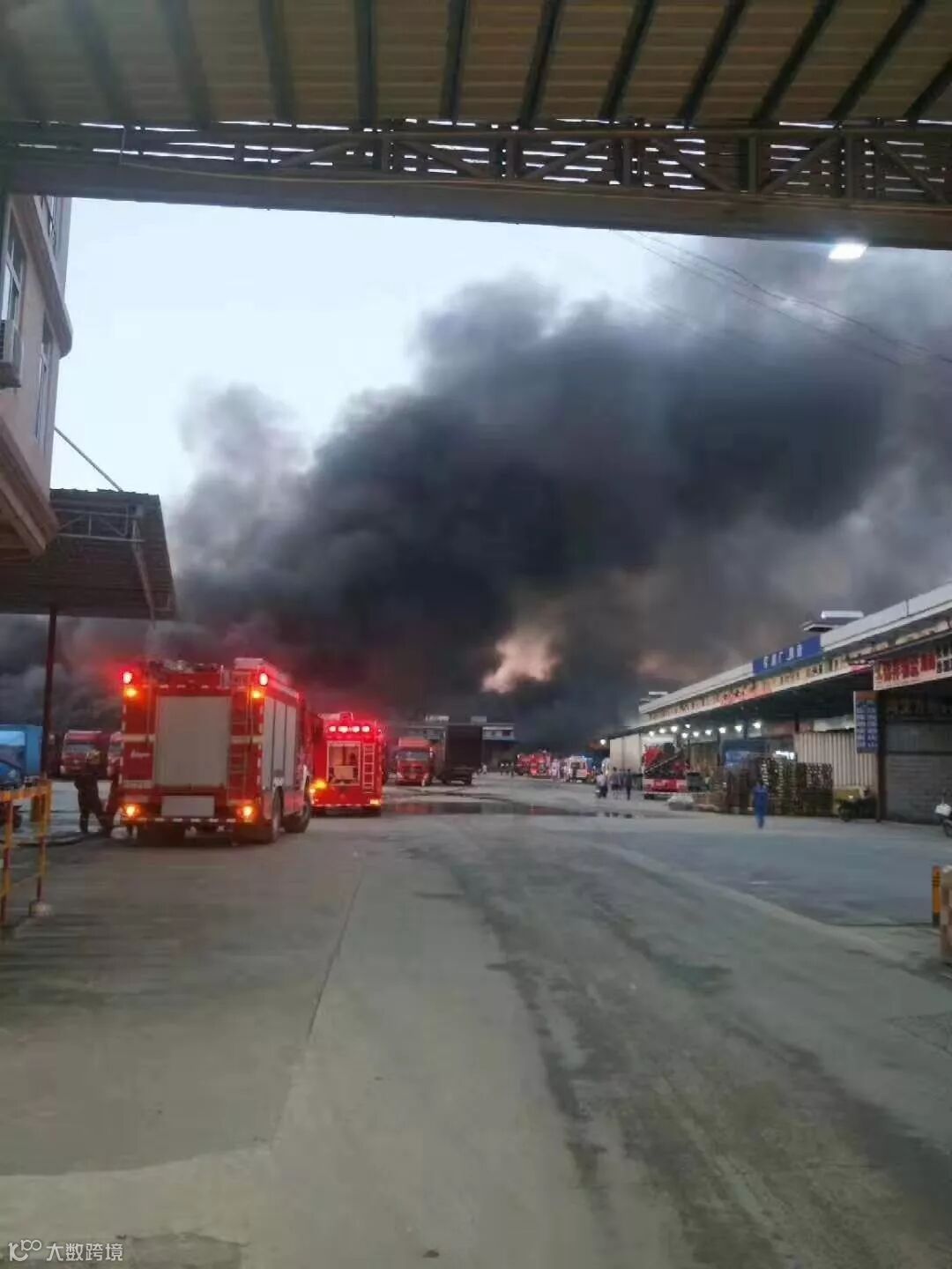 视频中整个仓库全部着火,燃烧的仓库冒出大量黑烟,视频中停在物流园的多辆货车也被烧毁,火势非常大。