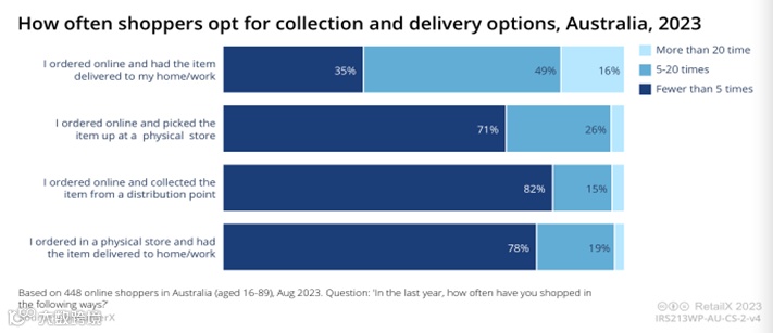 而另一方面,送货上门是澳大利亚消费者最喜欢的物流服务。Consumerx的调查结果显示,49%的消费者每年选择送货上门的次数为5-20次,16%的消费者多于20次。其次,线上下单线下取货、线上下单到分配点取货、线下购买送货上门也是澳洲消费者常见的物流选择。
