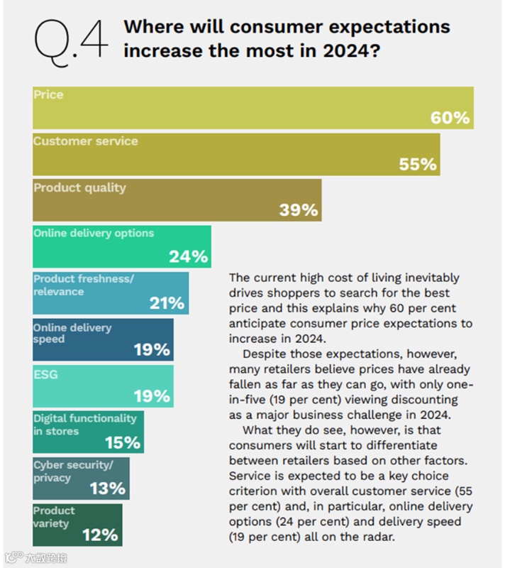 毕马威报告显示,在“2024年消费者期待哪些方面的变化?”的问题下,排名前六的方面分别是价格(price)、消费者服务(customer service)、产品质量(product quality)、线上物流选择(online delivery options)、产品新鲜度/相关度(product freshness/relevance)、线上物流速度(online delivery speed)。