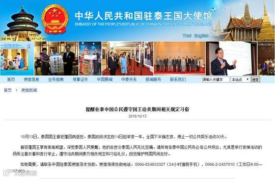 请所有在泰中国公民务必注意衣着和言行举止,遵守治丧期间泰方相关规定和习俗礼仪,自觉维护两国民间友好。