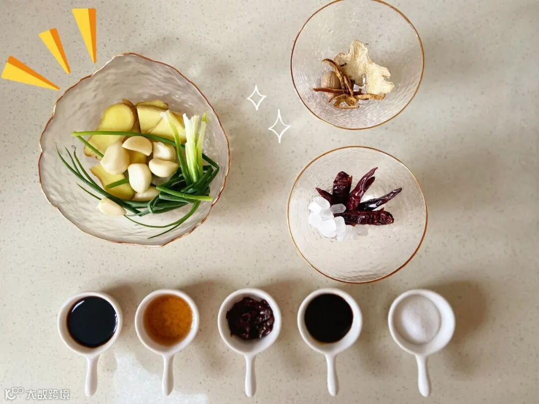 卤料包一个(含桂皮、八角、香叶等)、干辣椒、花椒、葱、姜、蒜、冰糖。