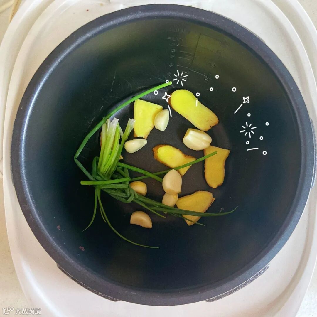 将葱、姜、蒜先放入电饭锅中,垫于底部,这样不容易糊锅哦~