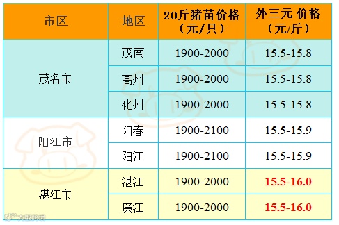 有红绿颜色部分是相对昨天有所变动的猪价;