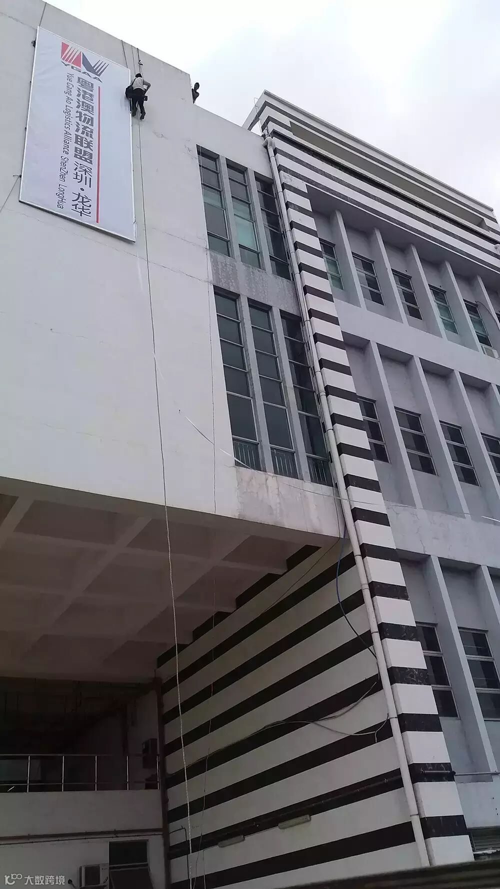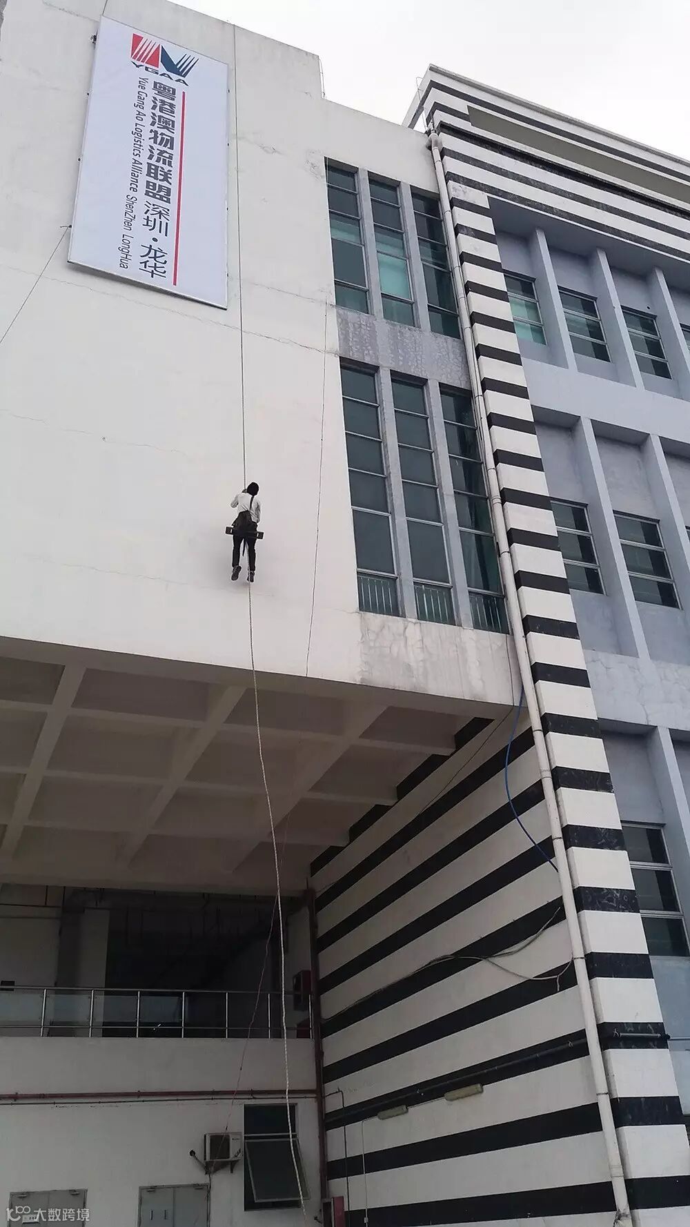 今天,在深国际华南物流园,他们靠着一根作业绳,“蜘蛛人”把自己悬挂在5层大楼外,为粤港澳物流联盟树立品牌形象。