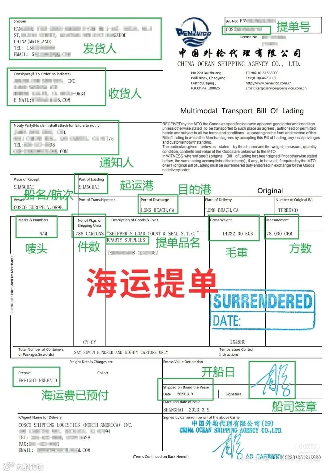 提单:货物交付给出口商的文件,证明货物的运输方式和目的地。