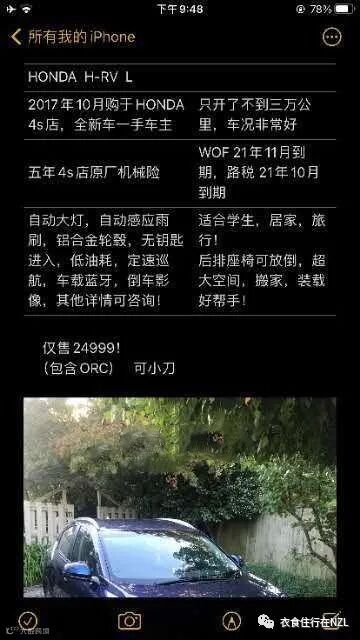 新西兰一手车2017年新车Honda HRV 24999d 可小刀 有意购买欢迎试车,