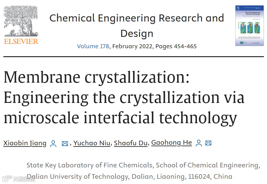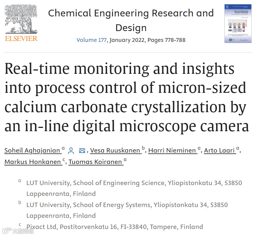 信息来源:《化学工程研究与设计》Chemical Engineering Research and Design期刊《化学工程研究与设计》Chemical Engineering Research and Design,是一本以工程技术-工程:化工综合研究为特色的国际期刊。该刊由ELSEVIER出版商创刊于1983年,刊期Monthly。该刊已被国际重要权威数据库SCIE、SCI收录。期刊聚焦工程技术-工程:化工领域的重点研究和前沿进展,及时刊载和报道该领域的研究成果,致力于成为该领域同行进行快速学术交流的信息窗口与平台。 《化学工程研究与设计》Chemical Engineering Research and Design在2022年的影响因子为3.9,Cite Score指数值为6.50。在该刊物2023年3月30日优选出的“颗粒技术主题”的5篇论文中,其中有2篇论文是该技术研究中最受关注、影响力最高的。其中一篇是由大连理工大学化工学院副院长、博士生导师姜晓滨教授等共同发表的论文《膜结晶:通过微尺度界面技术设计结晶》《Membrane crystallization:Engineering the crystallization via microscale interfacial technology》。文章中提到:高度可控、高效的结晶工艺是超纯固体产品和绿色工艺工程的迫切要求。特别是,微尺度成核的精确调控和晶体生长的强化是多学科、多尺度的课题,引起了许多研究者的关注。本文将系统地讨论膜结晶作为一种新型的微尺度界面技术,在混合过程中对界面过饱和度的控制、成核、颗粒运动和生长的原理进行综述。然后重点介绍了基于膜界面微尺度孔隙和通道的调控理论以及基于膜结晶技术的进一步应用。最后,概述了膜结晶作为一项新兴技术,对先进结晶工程的发展前景和重点研究方向进行了概述。论文原文地址,请复制到浏览器阅读 ↓ https://www.sciencedirect.com/science/article/abs/pii/S0263876221005670?via%3Dihub另一篇论文是由LUT大学化学工程学院Soheil Aghajanian教授、LUT大学能源与系统学院Vesa Ruuskanen教授、芬兰Pixact公司Markus Honkanen博士共同发表的《通过在线过程成像技术实时监测和洞察微米级碳酸钙的结晶过程》《Real-time monitoring and insights into process control of micron-sized calcium carbonate crystallization by an in-line digital microscope Camera》。论文中介绍了芬兰Pixact公司的PCM结晶监测系统及1-10μm的碳酸钙结晶反应过程的在线监测结果。实验证明:芬兰Pixact公司的PCM结晶监测系统可以很好地表征Dv10=3μm、Dv90=10μm的碳酸钙颗粒的颗粒度,并与实验室激光粒度仪的颗粒度表征结果吻合。在线过程成像技术解决了如何更好地对颗粒的成核、运动和生长过程进行监测和控制的难题。图1在线过程成像技术的颗粒表征Fig. 1. I11ustration of particle characterization from a microscope image. 图2 碳酸钙结晶过程中图像分析的PI控制器示意图和实验设备图Fig. 2 Schematics of the image analysis-based PI controller during the calcium carbonate reactive crystallization process and a photograph of the experimental equipment图4 PCM结晶监测系统的在线粒度与实验室激光粒度仪的粒度结果的比较Fig. 4 Comparison of particle size distribution obtained by the in-line image analysis-based probe and the offline laser diffraction measurement论文原文地址,请复制到浏览器阅读 ↓ https://www.sciencedirect.com/science/article/pii/S0263876221005025?via%3Dihub