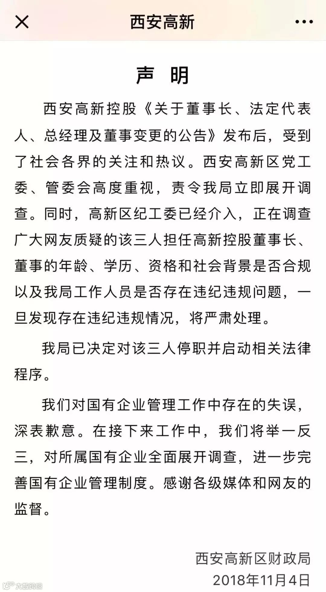 11月4日西安高新区管委会官方微信“西安高新”,发布西安高新区财政局声明,回应“千亿国企由80后任董事长,毕业仅1年95后任董事”事件。