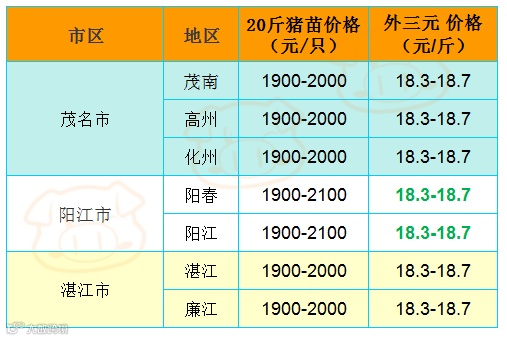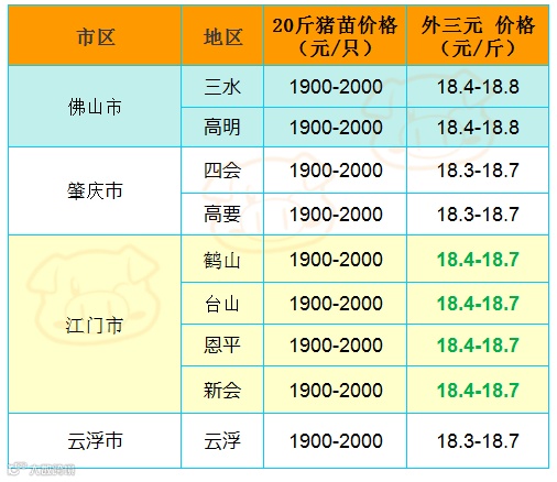 有红绿颜色部分是相对昨天有所变动的猪价;