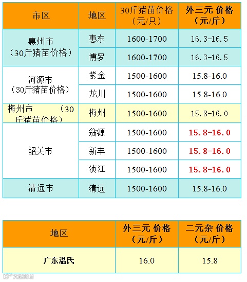 有红绿颜色部分是相对昨天有所变动的猪价;