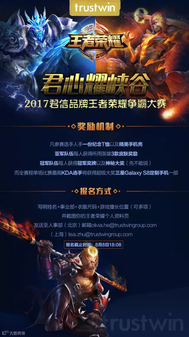 小编说到这就怒由心头起、恶向胆边生!为什么没有人叫上我一起开黑!我网速不好吗、段位不高吗、手速太慢吗?好歹我也“倔强”了好久啊!幸好老板英明,我们的机会终于来了,那些偷偷摸摸的同事们请不要再压抑自己的天性,那些单枪匹马的同事们请一起参团一起赢,公司即将举行一场2017君信品牌王者荣耀争霸大赛,该你上场表演啦!