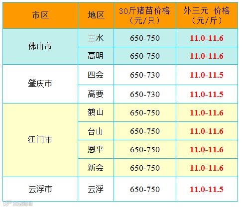 有红绿颜色部分是相对昨天有所变动的猪价;