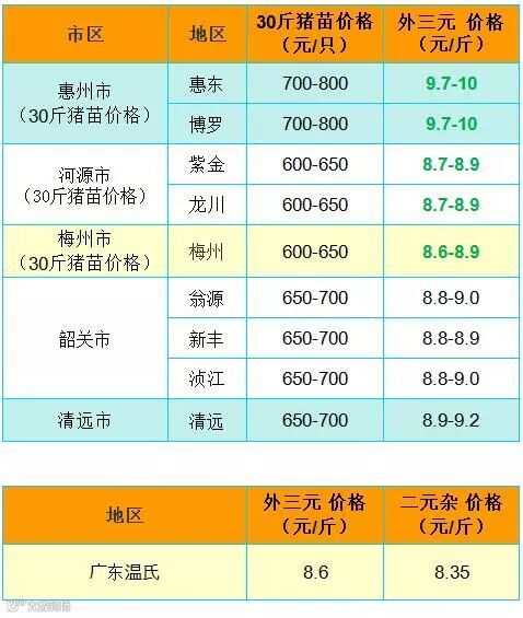 有红绿颜色部分是相对昨天有所变动的猪价;