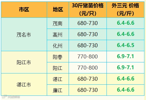 有红绿颜色部分是相对昨天有所变动的猪价;