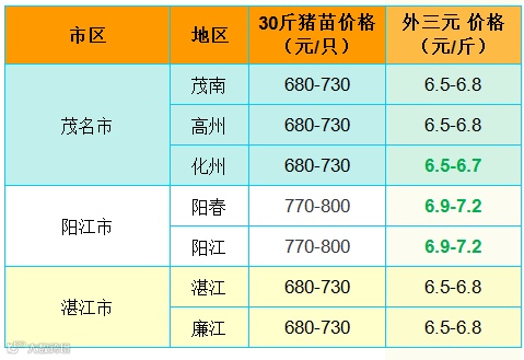 有红绿颜色部分是相对昨天有所变动的猪价;