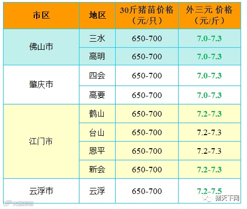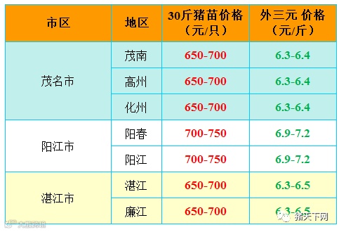有红绿颜色部分是相对昨天有所变动的猪价;