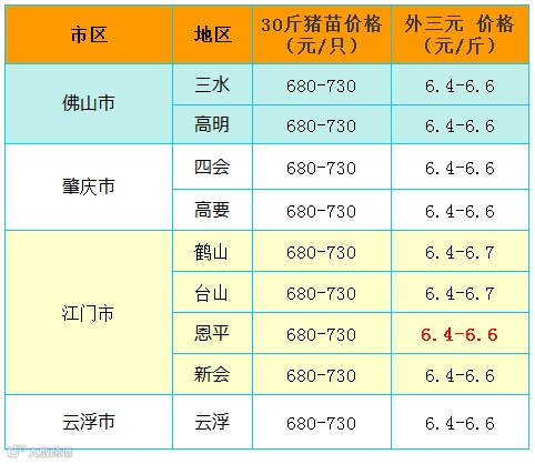 有红绿颜色部分是相对昨天有所变动的猪价;