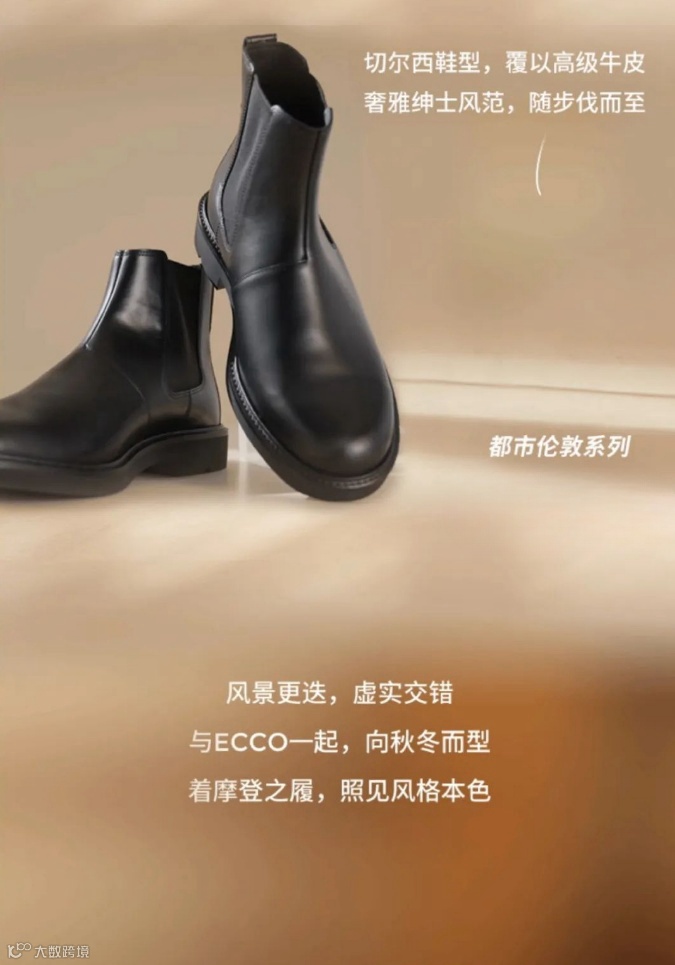 ECCO成立于1963年,作为北欧丹麦鞋履及皮具品牌,一直致力于将舒适与风格完美结合。其成功源于符合人体工学的产品设计及优质皮革。ECCO 是世界上为数不多完全达到资源垂直整合模式的制鞋公司之一,采用自上而下的营运模式,每个环节都直接监管.
