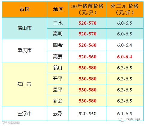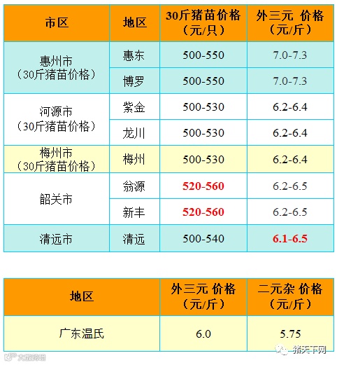 有红绿颜色部分是相对昨天有所变动的猪价;