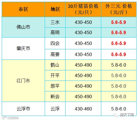 有红绿颜色部分是相对昨天有所变动的猪价;
