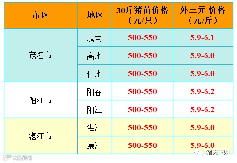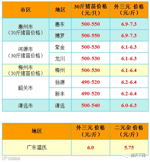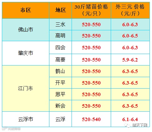 有红绿颜色部分是相对昨天有所变动的猪价;