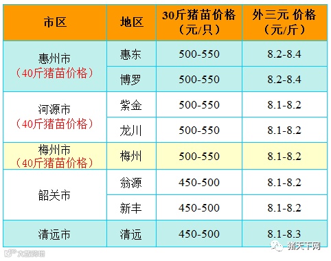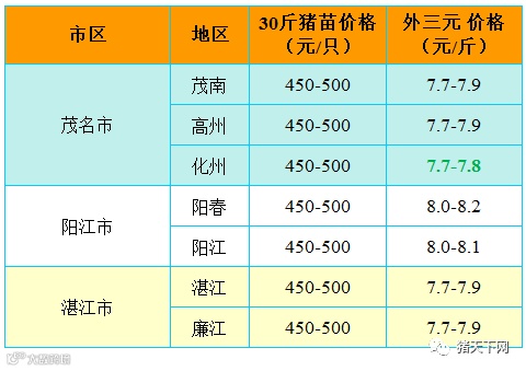 有红绿颜色部分是相对昨天有所变动的猪价;