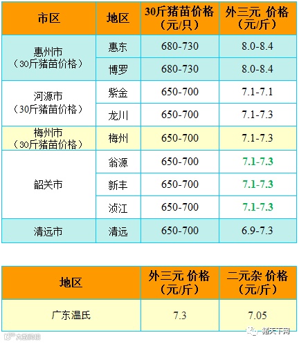 有红绿颜色部分是相对昨天有所变动的猪价;